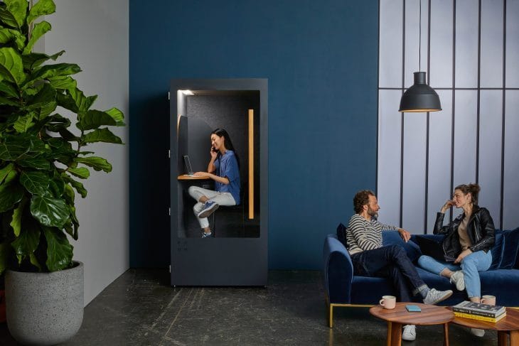 Moving beyond the materials, the latest edition of our office phone booth features a motion sensor that automatically turns off the LED light and ventilation fans when the booth is not in use, enabling more sustainable use of energy.