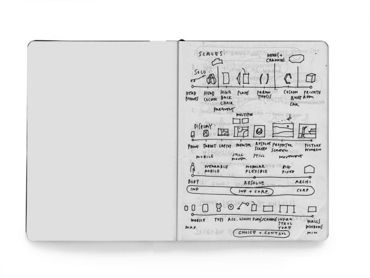 This defined our criteria: make more with less, create a small kit of parts, must be easy to move. Herman Miller weighed in with the two-hour, two people benchmark that led us to the free-standing architectural framework and solution. The elements had to be light enough and easy to move around, yet needed to feel substantial when you are sitting in it. We knew at that point we needed a vertical element to create the visual boundary and sense of enclosure. This would support the need to have writable elements, hang project boards or mount technology. Drawing and diagramming are part of our work tools.