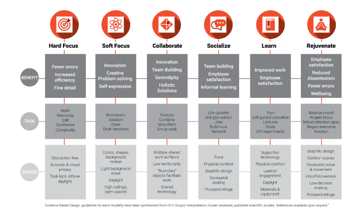 Work Modalities identifies six distinct categories based on task differences that lead to different space needs: Hard Focus, Soft Focus, Collaborate, Socialize, Learn, and Rejuvenate. All of us probably do each of these six things at work every day, or at least try to! Each, however, requires different cognitive processes and physical actions or equipment to perform effectively, and these differences are directly tied to – and impacted by – the surrounding environment. Our research has led to comprehensive criteria for designing spaces that accommodate these work modalities, allowing people to achieve their best work.