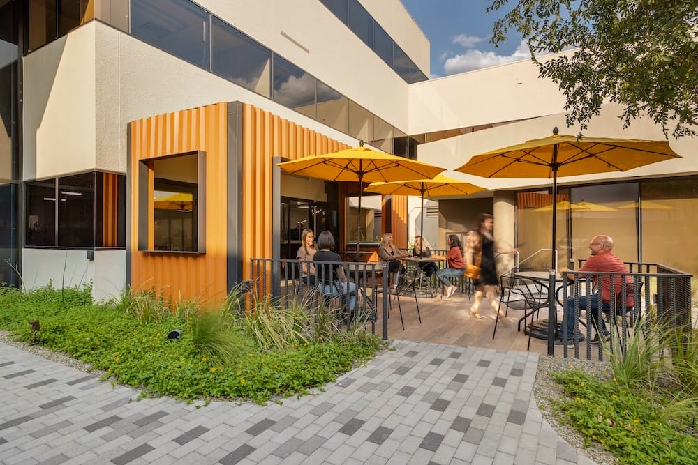 To achieve these goals, designers first moved the building directory to the middle of the courtyard. Next, the courtyard was divided into several new activity-based zones. To create an outdoor meeting space, the team opened the wall between the courtyard and the building’s shared training room and outfitted the new exterior-facing workspace with tables, chairs, banquette seating and an enclosure equipped with display monitors and A/V connectivity capabilities. Additionally, the facility’s existing common café, which had a small, covered patio that adjoined the courtyard, was expanded and modified to extend further into the outdoors. Colorful umbrellas were added to enhance aesthetics and invite people to utilize the area.