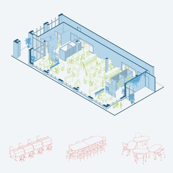 This dynamic nature of space use can support highly flexible remote workforces who are able to structure and schedule their activities. Asset management on or off site via contracted service providers, based on standardized quality, quantity and size of product offering to make process easy and seamless. Each activity dictates a kit of parts that is ordered on demand via an app. For example, you might say “Today, my team needs 20 sit-stand desks for focus activity, but tomorrow teams will break out in project groups and need team tables, white boards and digital smart boards to facilitate their work.”