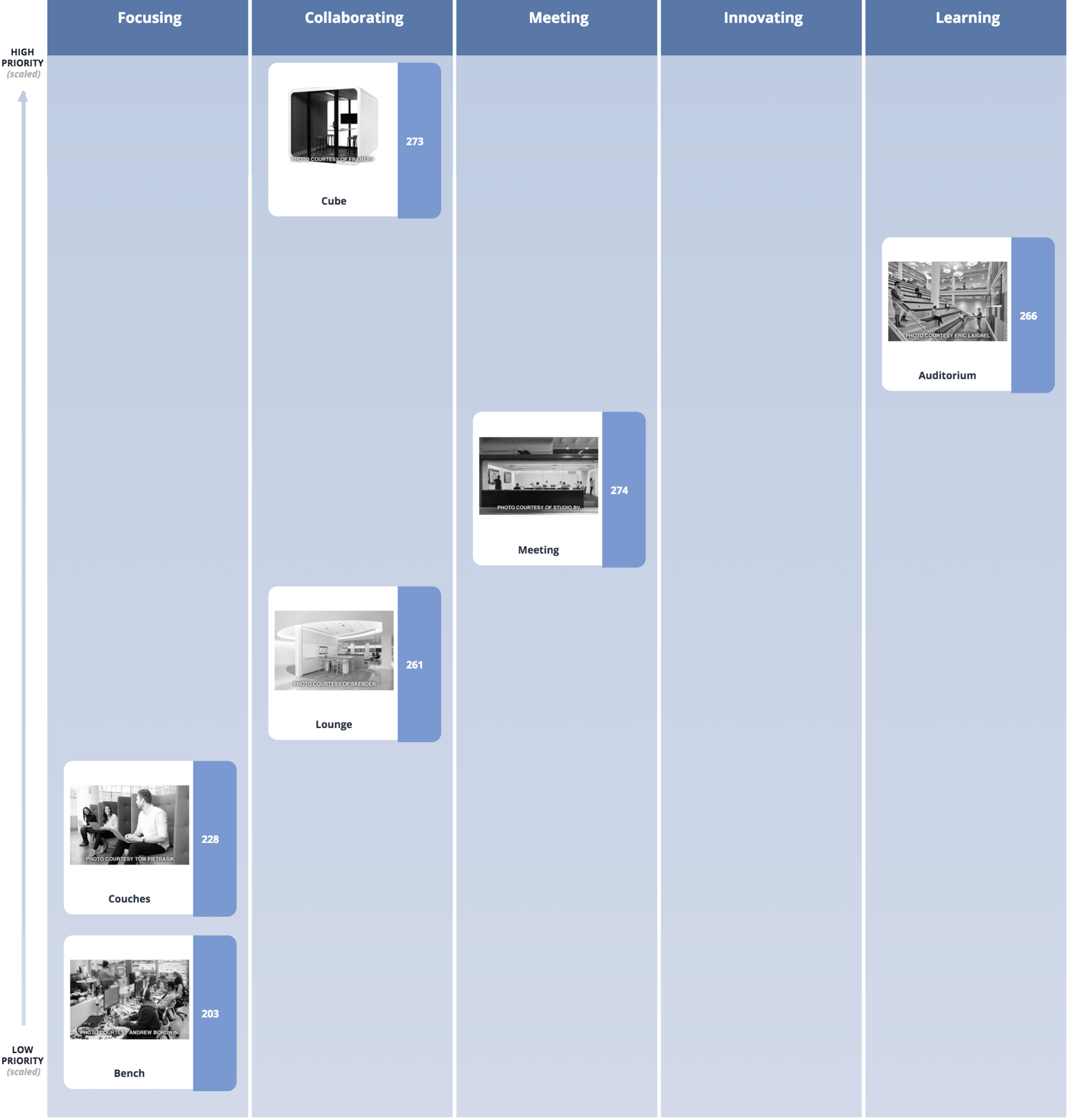 Without cutting & dicing the data, let’s describe each design in order of how they grabbed the attention of Work Design readers. Below we have included where each space fell within people’s explicit thoughts of the type of work each screen-centric was best utilized for and where these spaces fell within people’s implicit priority level (based on their behavior).
