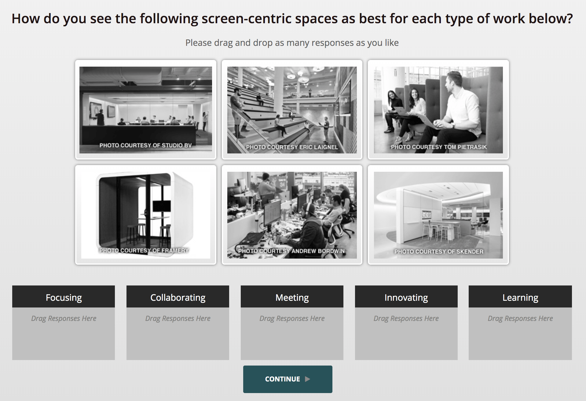 Specifically, we collected feedback on six screen-centric space designs. In these designs, screens are subtle yet important parts to the overall design and logical focal points. We presented the six designs in an interface as pictured below and asked whether you consider each design best for: focusing, collaborating, meeting, learning, or innovating.