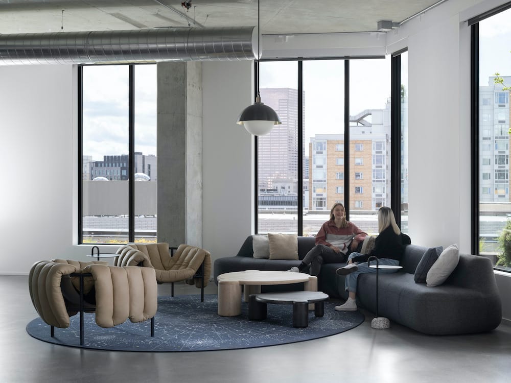 Acoustic panels are installed at the ceiling in the open office areas, helping to mitigate the large amounts of glass and other hard surfaces, and lighting types were thoughtfully layered to provide sufficient task lighting at workstations, as well as dimmable ambient light in lounge areas.