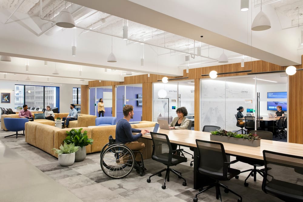 The project achieves United’s goal of offering a workplace experience that employees simply cannot get when working from home: a connected and purpose-driven brand experience; amenities that engage them and ultimately make their work more seamless; and an environment that centers their core values around sustainability, DEI, and customer service.