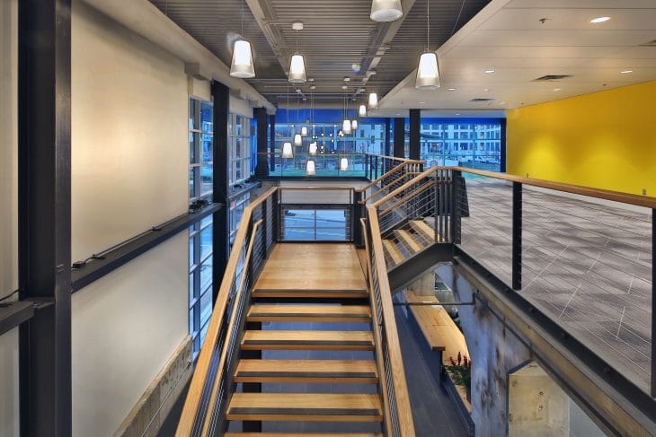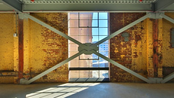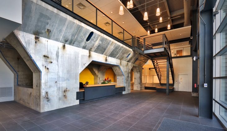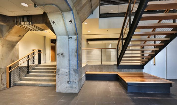 Because the building is mixed use, with retail/entertainment on the basement level and offices above, the two parts of the building are separated with a three-hour rated floor. This essentially creates two buildings per the building code, allowing for structural elements to remain non-protected on the upper levels. Without this design move, the structure would either have been hidden in walls, extensively fireproofed or painted with intumescent paint – all of which would have been costly and detrimental to the industrial aesthetic.