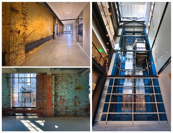 The developer’s goal was to maximize rentable square footage in the building. By adding floor plates and a rooftop expansion, the design team creatively increased the rentable square footage by nearly 210 percent. Because the building was initially designed as a working power plant-centered around machines, the design team worked to create elements that both embrace the building’s texture and history and address the human scale.