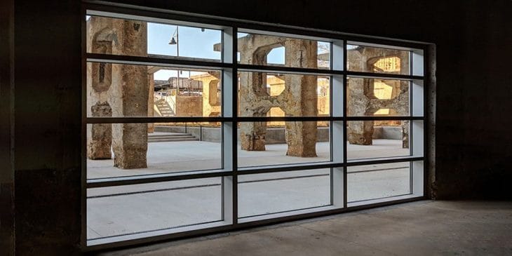 Exterior masonry and old windows & hardware were restored on-site. Due to the amount of steel projecting from the building which historically supported equipment, the design team opted to highlight these elements through paint rather than attempt to hide them.