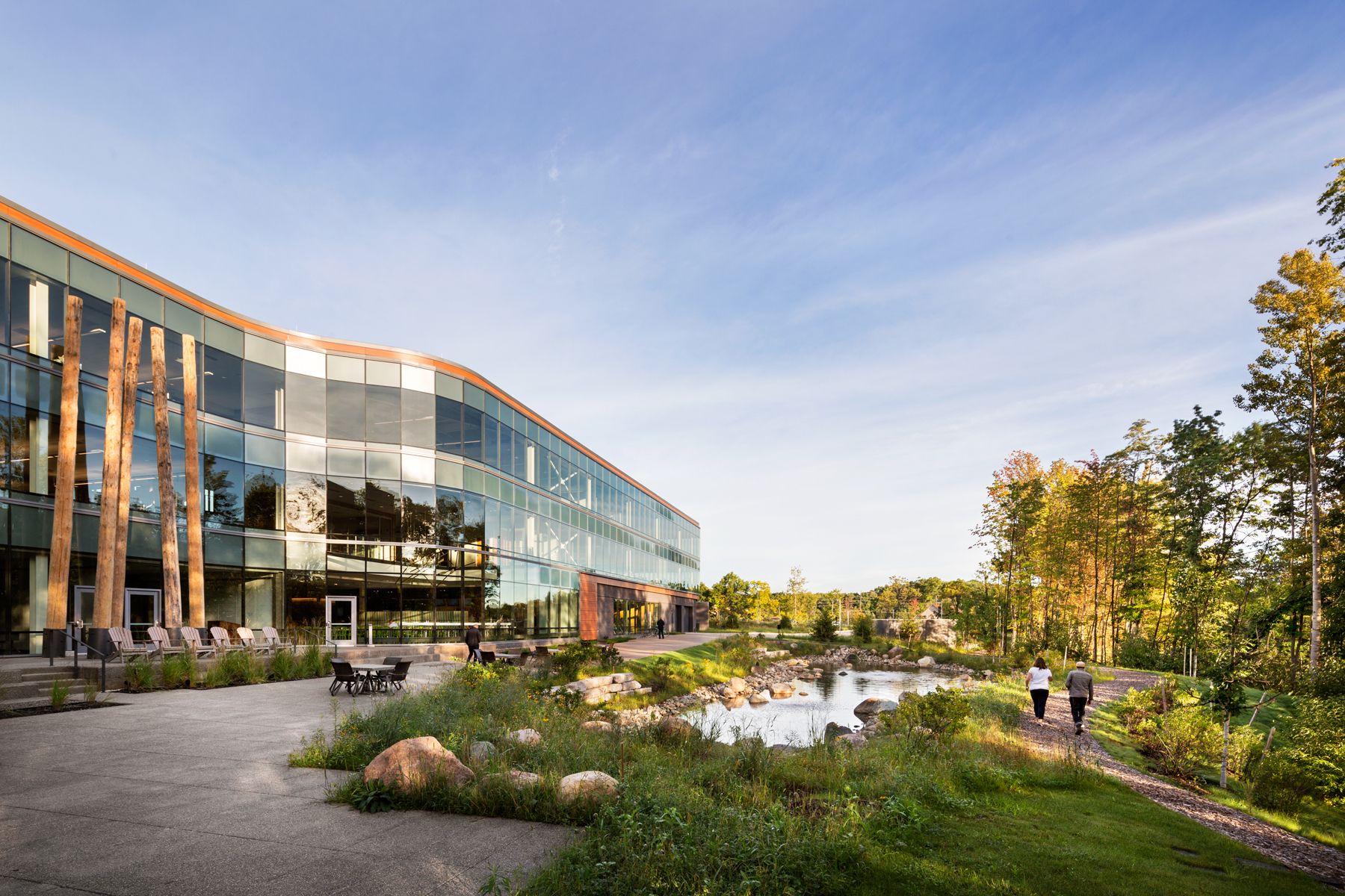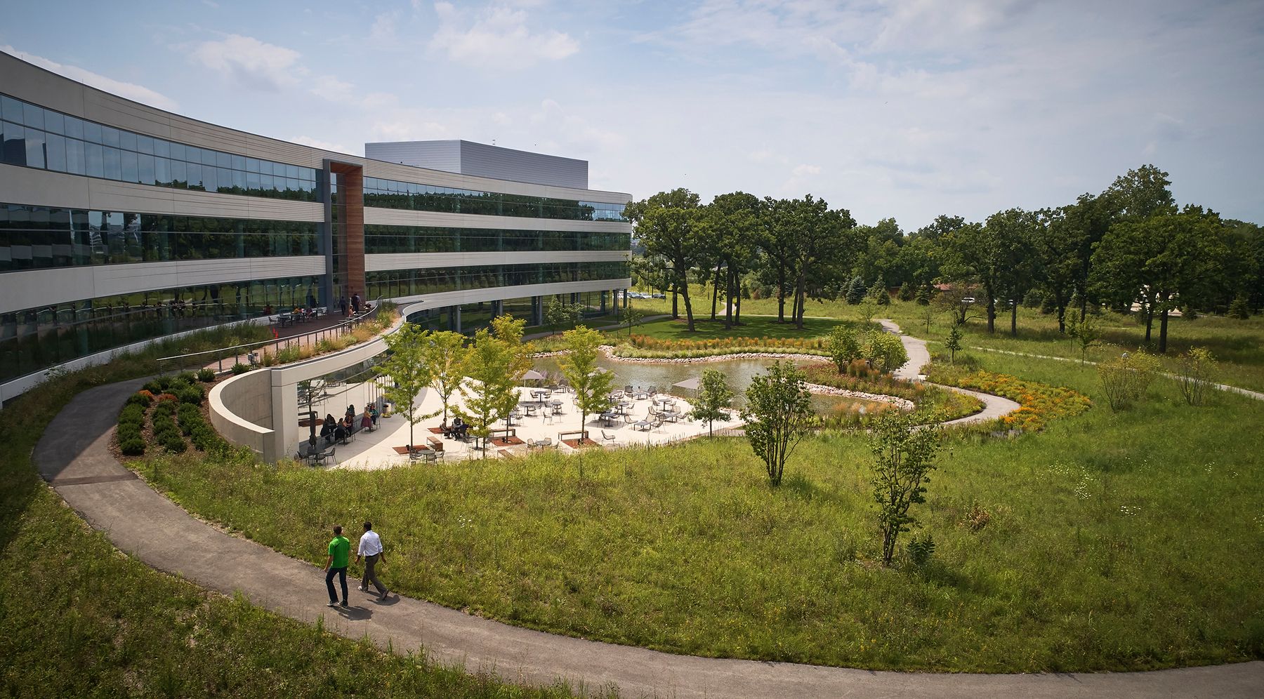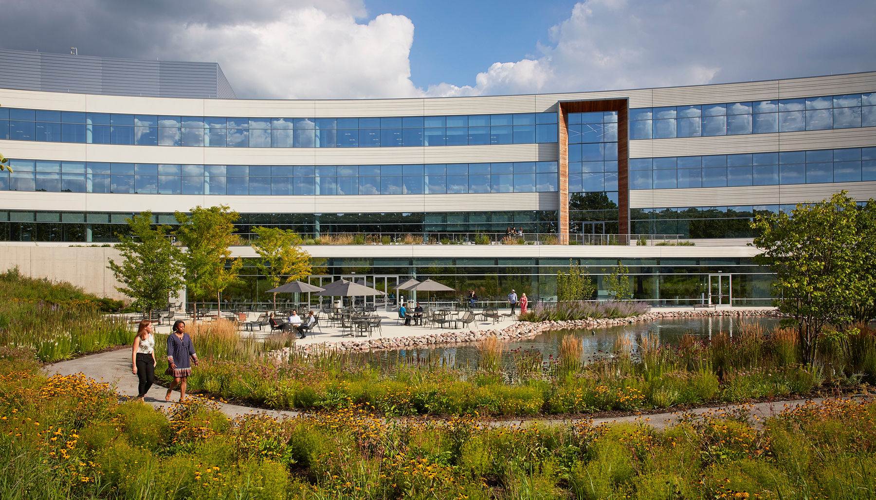 Focusing on employee wellness, the landscape and site design of the new headquarters brings outdoor experiences into close physical and visual proximity and ties them programmatically to the interior work environment. These spaces include a shaded lakeside dining terrace, wildflower gardens, and a looped trail network that connects to the building at multiple points and levels. The trails link employees with outside amenities designed for a full spectrum of uses, active to passive, and gathering spaces sized for a range of employee, family, and corporate gatherings.