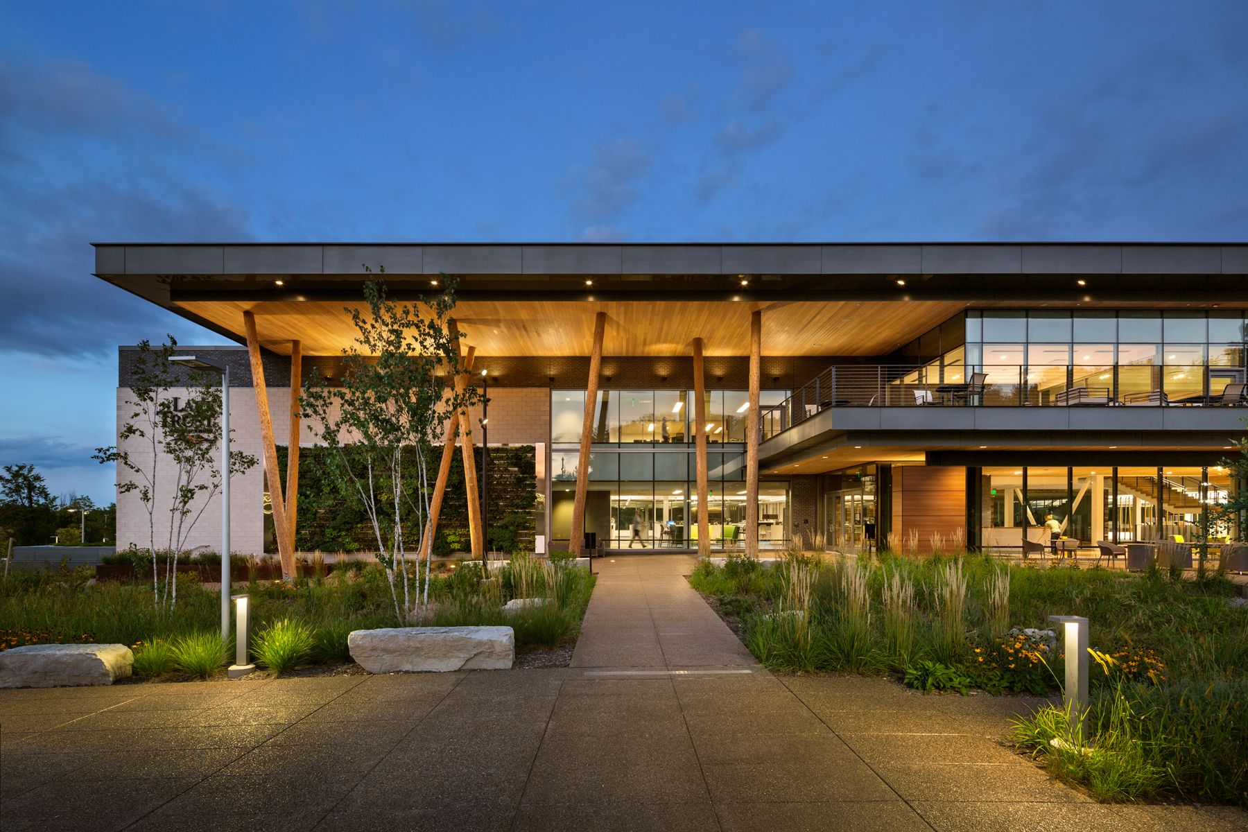 Lake Trust Credit Union Headquarters in Brighton, Michigan is another great example of mixing functionality and connection to the outdoors. The building was sited to ensure 90 percent of the significant trees remained both for their natural beauty as well as to act as a visual screen and buffer the sound from nearby roads. The office design mimics the 17 acres of natural surrounding with a large living wall that serves as the backdrop to the front entry porch, creating an inviting place to sit, work, or meet. Also, tree-like columns frame the entry overhang creating a welcoming approach, mimicking the original forest from years ago. The back patio, used by employees as a respite away from the workday, looks out on a pond with idyllic green surroundings.