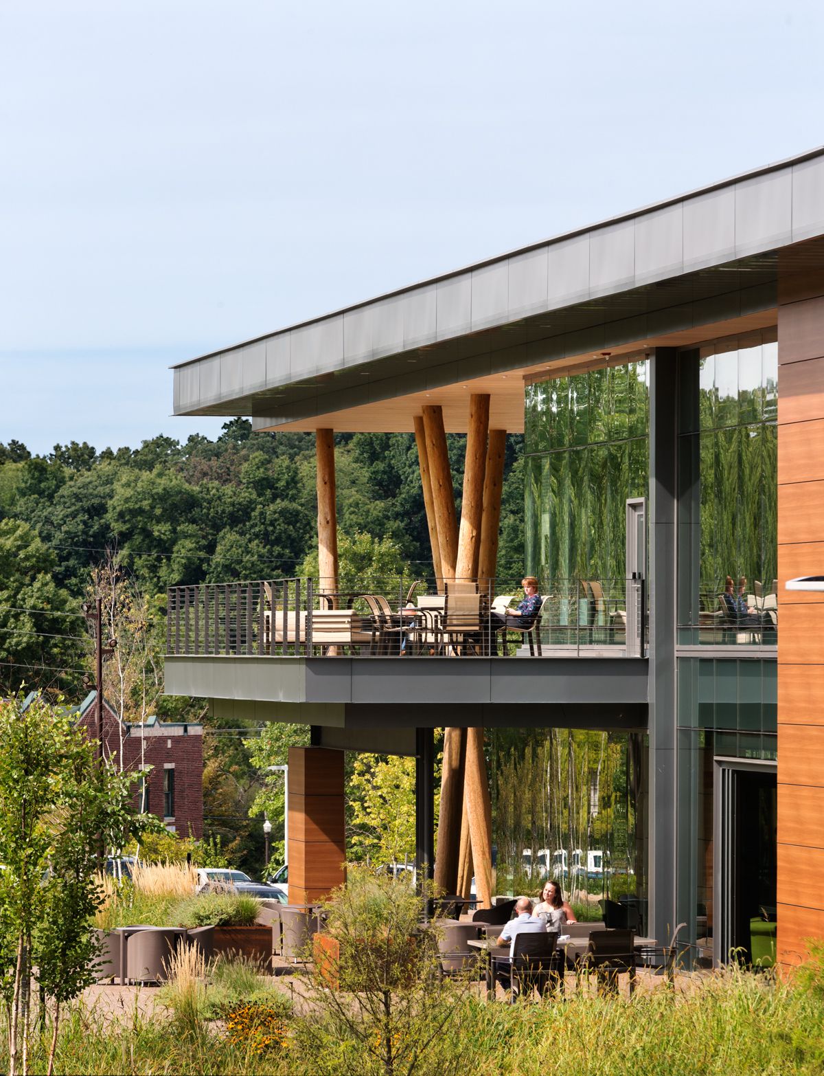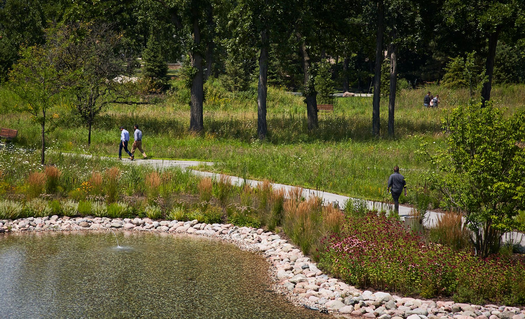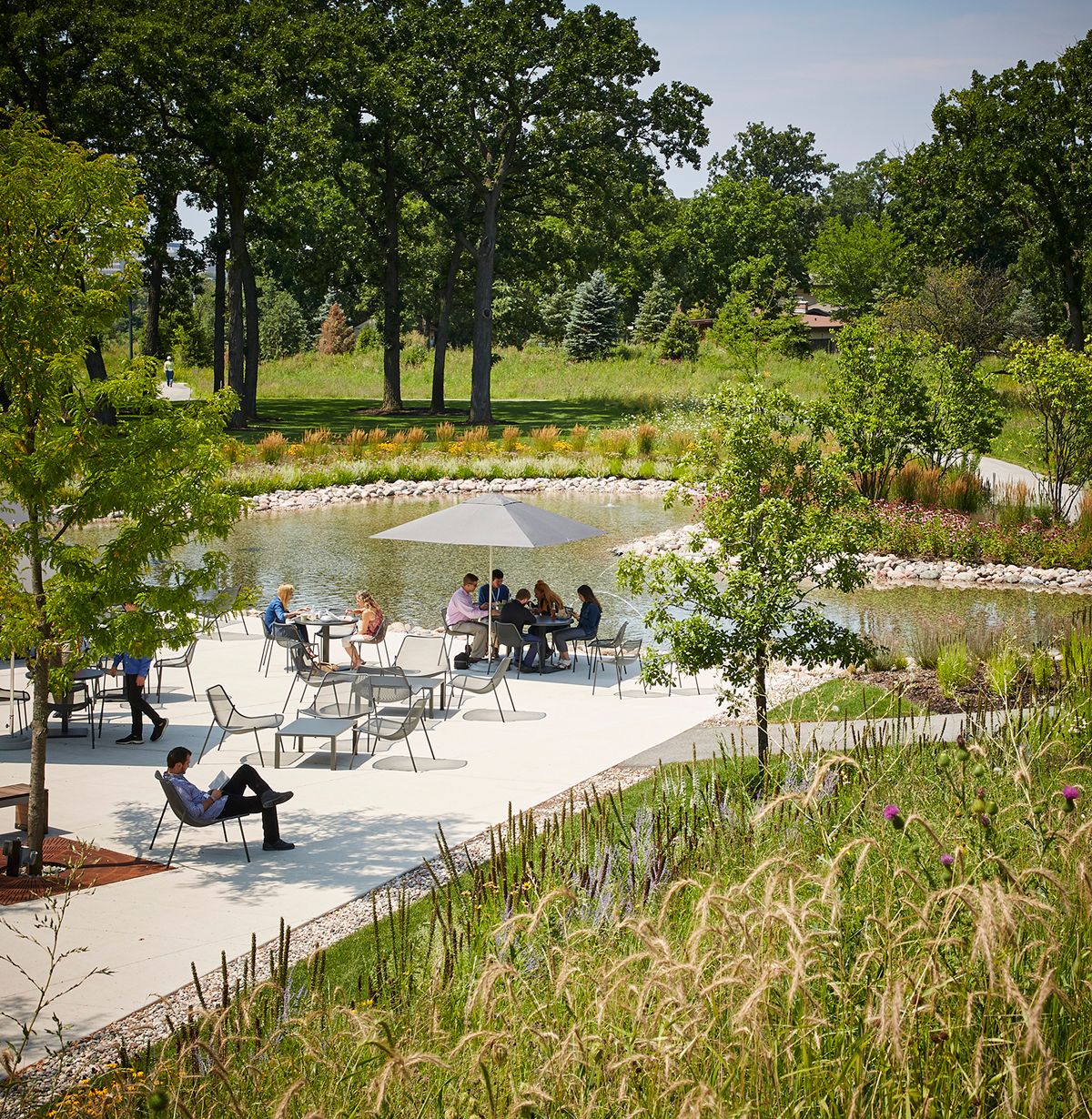 The most directly accessible and largest outdoor space is the lakeside dining terrace, an extension of the building’s cafe and dining room. The space offers movable furnishings to take advantage of warm sunny days or the dappled shade from the grove of honey locusts that partially cover it. An adjacent lake is a calming presence that cools the terrace and grounds the building, terrace, and surrounding landscapes.