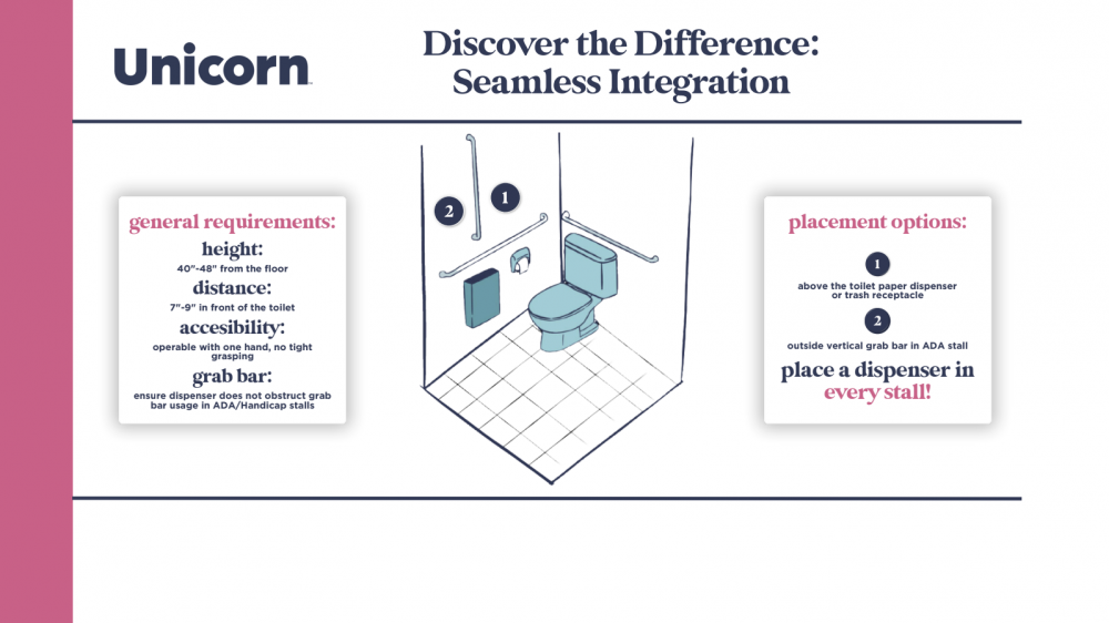 The Dispenser: At the heart of our solution is a wall-mounted dispenser that blends design with function. With clean lines and neutral finishes it blends seamlessly into modern restrooms while elevating the perception of care. The UNICORN dispenser is mechanical- free, gravity-fed for reliability, and effortless to install and refill. No tools, no downtime, no excuses.